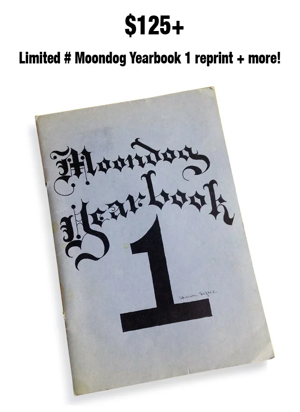 MOONDOG YEARBOOK 1! You’ll get a limited edition reproduction of an original pamphlet produced by Moondog in 1967, (it contains photographs of Moondog, music scores, poems, and other material written by Moondog) + Your name in the film’s Kickstarter credits (festival and home video versions) + Moondog postcard + Everything from our our $35 MOONDOG pledge level!