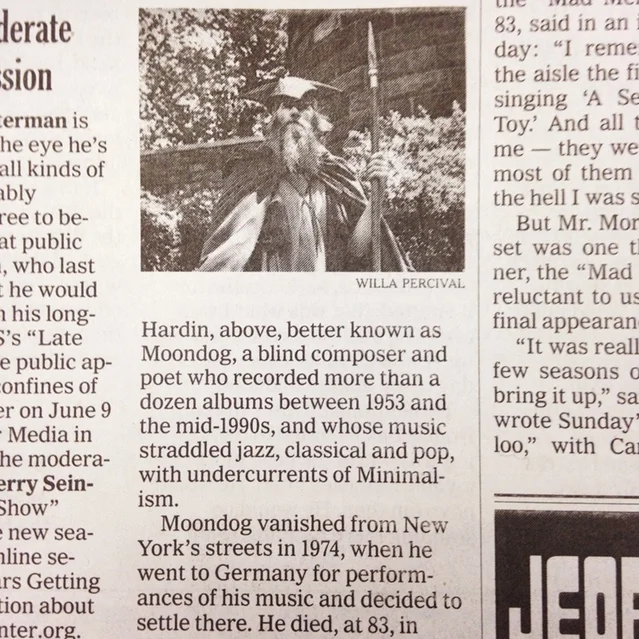 The piece is in print today, and you can also read it in full here: http://artsbeat.blogs.nytimes.com/2014/05/27/crowdfunding-a-documentary-about-moondog-a-departed-new-york-institution/